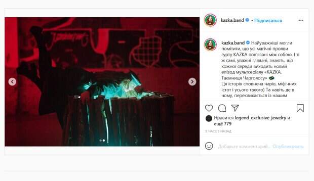 «Самые внимательные могли заметить, что все магические проявления группы KAZKA связаны между собой. И те же, внимательные зрители знают, что каждую среду выходит новый эпизод мультсериала «KAZKA. Тайна Чарголосу». Эта история полна волшебства, мифических существ и всего такого) и даже кое в чем, перекликается с нашим клипом», - написала Зарицкая, предложив фанатам посмотреть новую серию сериала. Кроме того, исполнительница поделилась новыми снимками, на которых она предстала в фэнтезийном образе. Зарицкая позировала в полутемной комнате черном наряде с плащом и беретом. На одном из снимков исполнительница наклонилась над загадочным колодцем, едва не падая в него. Поклонники группы тут же отреагировали на ее пост. «Настроение - смотреть в магический колодец», «Такая классная обстановка. Магическая и очень сказочная», «Супер, посмотрю обязательно», - пишут люди. Ранее мы писали, что на странице группы в Инстаграм появилось их новое совместное фото. На нем Александра Зарицкая, Дмитрий Мазуряк и Никита Будаш позируют в стильных нарядах в черной гамме. Напомним, музыканты из KAZKA впечатлили преображением, примерив мрачные образы: "Отпад". Как сообщала Politeka, солистка KAZKA Зарицкая в расстегнутой блузке впечатлила нестандартной внешностью: "Мои фиалковые глаза. ..". Также Politeka писала, что солистка KAZKA подразнила ножками, задирая пальто во время съемок в тяжелых условиях: "У нас задача...".
