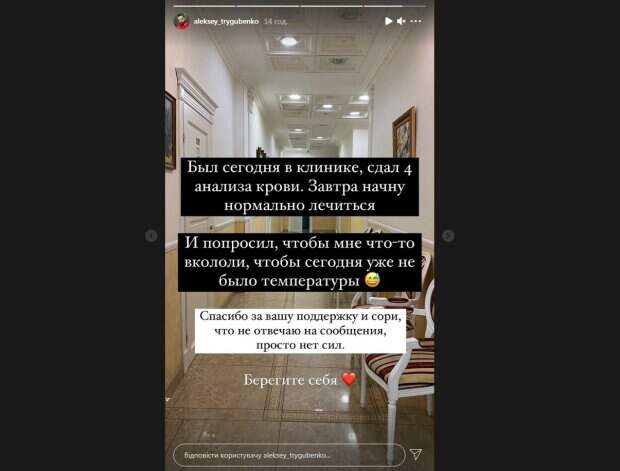 Завтра начну нормально лечиться. И попросил, чтобы мне что-то вкололи, чтобы сегодня уже не было температуры. Спасибо за вашу поддержку и сори, что не отвечаю на сообщения, просто нет сил. Берегите себя», - написал он. О своем диагнозе Тригубенко рассказал 15 марта. Повторный тест подтвердил у него COVID-19. У мужчины температура подскочила до 40 градусов, из-за чего уже несколько дней чувствовал он себя скверно. Тригубенко отмечал, что сбить температуру удавалось только на короткое время. Алексей признался, что хотел не записывать видеообращения, пока не станет чувствовать себя лучше, однако посыпался поток сообщений, в которых его спрашивали о самочувствии. Поэтому Тригубенко решил выходить в эфир, чтобы обо всем рассказывать. Напомним, Алексей Тригубенко дошел до финала проекта "Холостячка" и стал на одну ступень с Александром Эллертом в борьбе за сердце актрисы Ксении Мишиной. Напомним, финалист "Холостячки" Тригубенко, который борется с опасным недугом, записал обращение: "Стало плохо..." Как сообщала Politeka, финалист «Холостячки» Тригубенко заговорил о предательстве Мишиной: «Было страшно, что…» Также Politeka писала, что финалист "Холостячки" Тригубенко признался, кто разбил ему сердце, Мишина была не первой: "Сейчас локти кусает. .."