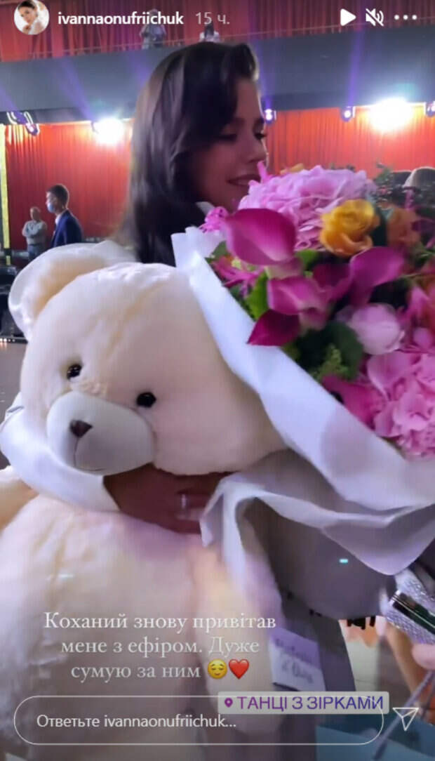 Недавно стало известно, что она заменила место Тины Кароль на шоу "Танці з зірками". На этот раз Иванна Онуфрийчук поделилась новым видео на своей странице в Инстаграм. На кадрах она показывает, какой сюрприз её ждал после эфира шоу "Танці з зірками". Иванна держит огромный букет цветов и белого плющевого мишку.  "Любимый снова поздравил меня с эфиром. Очень скучаю по нему", призналась телеведущая. Как известно, телеведущая замужем за казахским бизнесменом Алмазом. Она не раз говорила, что он не медийная личность, но уважает её работу. У него бизнес в Швейцарии и поэтому он живет там. Ранее сообщалось, Онуфрийчук после первого эфира "Танців з зірками" эмоционально обратилась к украинцам: "Хочу каждого из вас..." Также, новая ведущая "Танців з зірками" Онуфрийчук показала, чем балует мужа-миллионера: "Лайфхаки для вас, девочки" Politeka рассказывала, новая ведущая "Танців з зірками" Онуфрийчук покинула Украину после первого эфира: что произошло