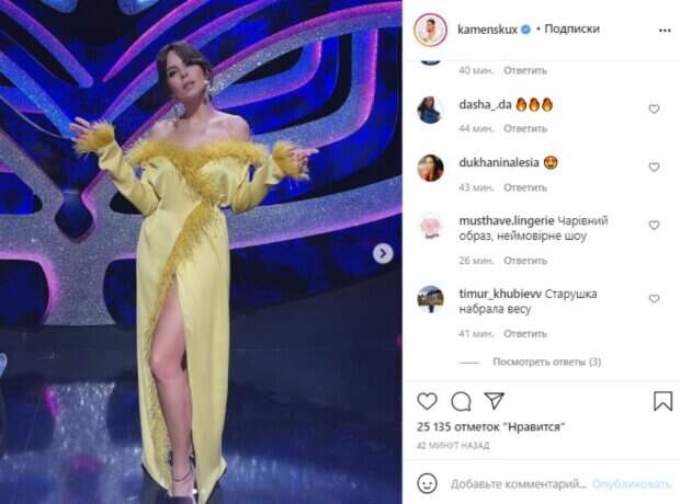 Горячая брюнетка в последнем эфире появилась в желтом платье на запах, с отделкой из перьев. Настя пленила сочными изгибами и пощекотала нервишки объявлением, связанным с проектом. "Вчерашний выпуск шоу @maskaukrainetv был особенно эмоциональным и захватывающим!