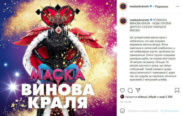 Она одета в латексный комбинезон, у нее невероятная обувь, сделанная на заказ. Плечи героини покрывает шикарная шуба, на пошив которой ушло 20 метров бархата и более 10 метров искусственного меха, имитирующего соболиный», - рассказали создатели шоу. Кроме того, за героиней будет тянуться 2-метровый шлейф, а ее голову украшает роскошный головной убор с огромным сердцем, пиками и шипами. Многие украинцы в комментариях заподозрили, что за такой эпатажной маской может скрываться певица MARUV. Однако, были и другие варианты. «Ого!! На ум приходит только Марув. костюм супер», «Там будет Билык 99%», «Уже жду шутки Андрея Михайловича про шубы», «На Марув похожа, может она под маской!?», «Никитюк Леся 100%», «Мне кажется, что там может быть Марув, Вика Смеюха, либо Слава Каминская», - пишут люди. Напомним, Полякова заставила DZIDZIO хохотать на шоу Маска, показав пару жестов. Как сообщала Politeka, рассекречен новый герой "Маски", украинцы теряются в догадках. Также Politeka писала, что шоу "Маска" 2 сезон, новый рассекреченный герой поставил украинцев в тупик.