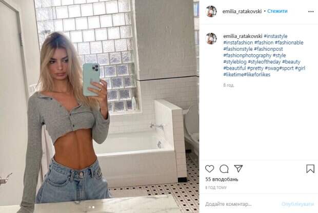 Американская модель Эмили Ратаковски похвасталась соблазнительными изгибами в короткой кофте Как передает Politeka.net, фотография звезды появилась на ее фан-страничке. Эмили сделала фотографию в зеркале. Она одела широкие объемные штаны, которые с трудом держались на бедрах. Наверх модель надела короткую обтягивающую кофту, которую расстегнула до половины.