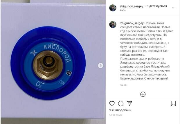 " был госпитализирован в ялтинский ковидный госпиталь, развёрнутый на базе Ливадийской больницы. «Похоже, меня ожидает самый необычный Новый год в моей жизни. Запах елки и даже вкус оливье мне недоступны. Но поскольку любовь к жизни в человеке победить невозможно, я буду на этот оливье смотреть. Я столько раз его ел, что вкус я как-нибудь вспомню», - написал артист. Он поблагодарил врачей за их работу и пожелал всем здоровья. Также Жигунов показал кадры с больницы. В Сети желают артисту скорейшего выздоровления. «Сергей, желаю Вам поскорее справиться с этим недугом!!!!! Следующий год будет добрее ко всем нам!!! Пусть у вас все будет хорошо, счастья вам и хорошего настроения!!!», "Крепкого здоровья!!!