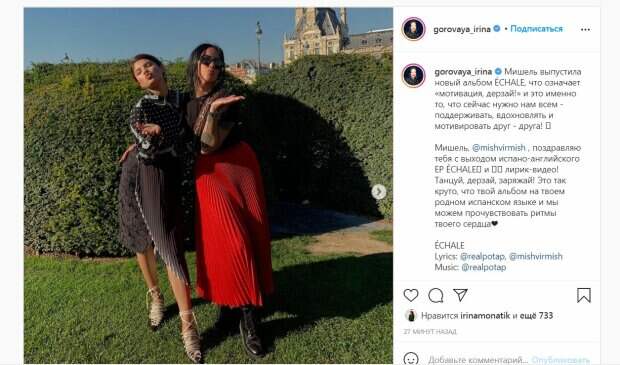 В этот раз бывшая жена Потапа разместила яркое совместное фото с певицей. Обе позировали в плиссированных юбках и посылали воздушные поцелуи, приобнявшись. Образы красоток были стильными и, благодаря аксессуарам, завершенными. В посте продюсер рассказала о новом хите подопечной Потапа, который также "продвигает" Мишель. "Мишель выпустила новый альбом ÉCHALE, что означает «мотивация, дерзай!» и это именно то, что сейчас нужно нам всем - поддерживать, вдохновлять и мотивировать друг - друга!