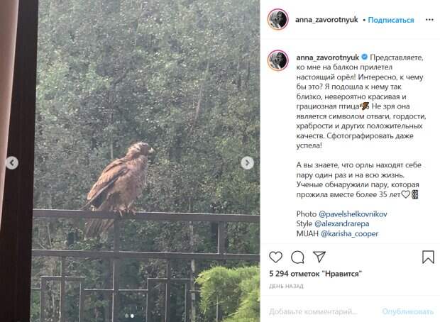 Интересно, к чему бы это? Я подошла к нему так близко, невероятно красивая и грациозная птица. Не зря она является символом отваги, гордости, храбрости и других положительных качеств. Сфотографировать даже успела!», - написала девушка. Она также рассказала, что орлы находят себе пару один раз и на всю жизнь. Заворотнюк поделилась двумя новыми фото. На одном она запечатлела самого героя поста. Орел действительно уселся прямо на балконе ее дома. На втором же фото сама Анна позирует в своей спальне. При этом на фото она позирует во всем черном, будто в трауре. Стоит отметить, что в комментариях к посту девушке рассказали, что появление орла может стать плохой приметой. «У меня прилетал перед смертью мамочки. Я не знала о такой примете. А потом мамы не стало», - написала одна из комментаторов. Другие комментаторы также забеспокоились о состоянии матери красотки, которая уже давно борется с раком мозга. «А мама жива?», - интересуются люди. Комментаторы также обратили внимание на то, что глаза Анны на фото выглядят очень грустными. Впрочем, для большинства такие приметы остаются просто суевериями. Напомним, дочь Заворотнюк взбудоражила откровенным фото в ультра-мини и неожиданным признанием. Как сообщала Politeka, дочь больной раком Заворотнюк с идеальной укладкой рассказала о своих развлечениях. Также Politeka писала, что печальная дочь Заворотнюк облачилась во все черное и потрясла признанием: "Время подводить итоги".