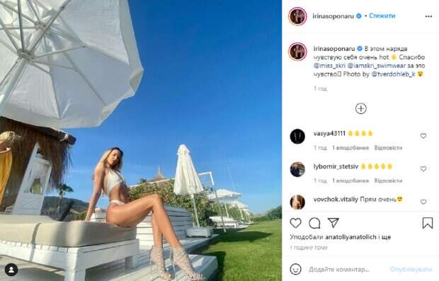 На новой фотографии Ирина запечатлена на отдыхе, она присела на диванчик пляжного бунгало и изящно позирует фотографу. Перед камерой актриса появилась в соблазнительном белом купальнике интересного фасона, а свой образ дополнила оригинальными босоножками на каблуках. Волосы девушки распущены и аккуратно уложены, а на лице легкий макияж, она с вызовом смотрит прямо в объектив. В подписи к фотографии Сопонару написала: "В этом наряде чувствую себя очень hot. Спасибо за это чувство". Пользователи тут же кинулись обсуждать такое соблазнительное фото красотки, оставляя комплименты в комментариях. "Прям очень", "Ого, какая красотка", "Это да, горячая штучка", "Фантастика", "Шикарная леди", "Очень круто", "Какая красивая", "Красиво", "Какая женщина", "Это был контрольный в голову, просто мечта", "Супер", "Эти ноги", - пишут восторженны поклонники. Напомним, Подвыпившая блондинка из "Женского квартала" пошалила, приспустив бретельки платья: "Суперовая". Как сообщала Politeka, Шальная блондинка из "Квартал 95" взволновала обнаженными плечиками: "Совершенство во всем". Также Politeka писала, Заводная блондинка из "Женского квартала" похвасталась пластикой и сняла все на видео: "Вау, так чувственно".