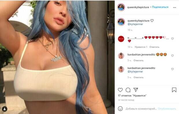 В целом, девушка давно известна своей любовью к сменам цвета волос. Примечательно, что ее увлечения экспериментами не остается без внимания, даже когда Кайли делает это лишь на день или два. Так как она любит пари, чаще всего звезда выбирает длинные локоны, яркого оттенка: от светло-розового до небесно-голубого и даже ядовито-зеленого. Но всегда при этом она возвращается к своему натуральному темно-каштановому оттенку. На фан-аккаунте восхитились одним из самых запоминающихся преображений звезды. Тогда Кайли ходила с бирюзовым оттенком волос, за что ее прозвали Мальвиной. В белом топе на тонких лямках и ярком макияже Дженнер не стала стесняться. Также модель и предпринимательница устроила небольшую съемку на улице возле дома. Причем сделала акцент Дженнер на новые джинсы с высокой талией и цветной яркий топ с глубоким декольте. Оригинальный дизайн одежды, выгодно выделяющей линию талии и бюста, сразу же обратил на себя внимание фанатов. «этот наряд и детали