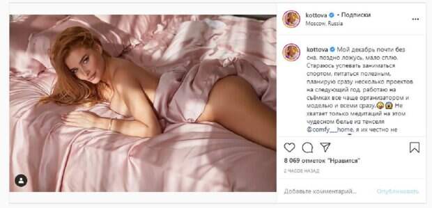 Кадр получился очень соблазнительным и легким. Об этом пишет Politeka.net со ссылкой на страничку знаменитости. "Мой декабрь почти без сна, поздно ложусь, мало сплю. Стараюсь успевать заниматься спортом, питаться полезным, планирую сразу несколько проектов на следующий год, работаю на съемках все чаще организатором и моделью и всеми сразу", - написала звезда под фото. Фанаты поставили почти 10 тысяч лайков и написали комментарии: "Шикарная, самая красивая, нежная, Татьяна", "Не помните реквизит!!)", "Да, медитации не помешали бы", "Так соблазнительно на этом белье!", "У меня очень много работы, уже хочется отдыхать", "Соблазнительная", "Какая же ты прекрасная! У меня сейчас куча дел, надеюсь, что всё скоро закончится". Мы писали, что известная певица и модель Татьяна Котова, бывшая участница группы "ВИА Гра", разоткровенничалась с фанатами, сидя в авто. Она смотрит в камеру в лучах солнца. Образ дополняет идеальный макияж, который подчеркивает красивое лицо звезды. Напомним, экс-ВИА Гра Котова в прозрачных кружевах сверкнула своей розочкой Также Politeka писала, что жгучая экс-ВИА Гра Котова шаловливо расставила ноги перед камерой А еще Politeka сообщала, что экс-ВИА Гра Котова приспустила блузу и показала свою красоту крупным планом