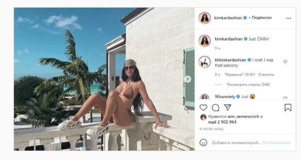 net со ссылкой на страничку знаменитости. "Отдыхаю", - написала звезда под фото. Сестра Ким Хлои сразу прокомментировала публикацию: "Хотела бы я быть тем балконом", - написала звезда. Фанаты поставили почти 3 тысячи лайков и написали комментарии: "Вот она", "Тело", "Только что", "Неужели я одна задаюсь вопросом, снова ли они вместе?", "Симпатичные кроссовки, Ким", "Слушай, Ким сказала, что теперь она одна, хорошо", "Просто расслабься", "Все еще в настроении, вы, ребята, снова вместе?", "Верни моему мальчику все его кроссовки !!!", "Ты просто богиня", "Подождите, у нее все еще есть", "Ким, ты невероятно привлекаешь своим телом". Мы писали, что популярная модель, бизнесвумен и блогер Ким Кардашьян показала, как выглядела до популярности. Звезда решила показать себя до всех манипуляций, опубликовав снимок в Инстаграм. Кадр датируется 1996 годом. 16-летняя ким позировала в голубой футболочке и синей мини-юбке. Две заколочки в волосах стали отличным завершением столь незатейливого образа. Напомним, мокрая Ким Кардашьян в прозрачной блузе ошеломила размером своих прелестей А еще Politeka писала, что Ким Кардашьян пленила размерами своих "дынек", приняв пикантную позу на спине Также Politeka сообщала, что Ким Кардашьян в коже и мини дала волю внутренней хищнице, жаркое фото