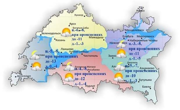 Сегодня в Татарстане ожидается облачная погода с прояснениями, в отдельных районах туман. На дорогах может образоваться гололедица, предупреждает Гидрометцентр РТ. Днем температура воздуха в Казани составит -3..-1 градус, в Набережных Челнах -5..-1 градус, в Бугульме -3..-1 градус, в Чистополе -4..-1 градус, в Буинске -4.