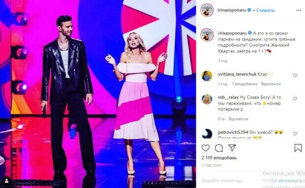 На опубликованном снимке видно, что Сопонару стоит на сцене рядом со скандальным украинским певцом Максом Барских. «Класс», «он живой? После свидания», «невероятно классная», «Тебе нравится песня бумбокс вахтерам? Просто интересно?» - пишут ее поклонники. До этого мы рассказывали, что Ирина Сопонару похвасталась роскошной фигурой в черном платье У себя в Инстаграм актриса опубликовала серию фото, на которых предстала в обтягивающем платье. Судя по всему, фото было сделано перед съемками, так как Ирина была с микрофоном на лице. Можно предположить, что это образ Ирины с нового концерта. Она позировала на камеру, нежно сложив руки и повернувшись спиной к объективу. Выглядела Сопонару одновременно соблазнительно, пикантно и нежно. Ее изгибы свели с ума поклонников. За 40 минут пост Сопонару собрал почти 3 тысячи лайков. В комментариях ей оставили массу приятных слов. Напомним, что Ирина Сопонару свела с ума постельными шалостями в одном белье: "Могут только девочки". Как сообщала Politeka, Ирина Сопонару произвела фурор в платье с огромным вырезом до пупка: «Вау». Также Politeka писала, что Ирина Сопонару обтянула прелести, ошеломив солнечной красотой: «Хороша».
