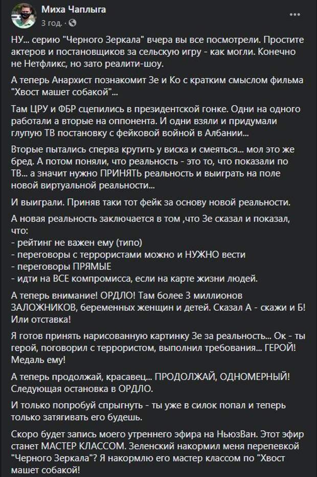 По словам политолога, на Донбассе также находятся пленные украинцы, которых нужно освобождать. "Там более 3 миллионов заложников, беременных женщин и детей. Сказал А - скажи и Б! Или отставка!", - считает политолог. Также он отметил, что приняв условие террориста в Луцке президент должен проявить себя в переговорах с боевиками "Л/ДНР" "А теперь продолжай, красавец... продолжай, одномерный! Следующая остановка в ОРДЛО. И только попробуй спрыгнуть - ты уже в силок попал и теперь только затягивать его будешь", - заключил политолог. Напомним, президент Украины Владимир Зеленский выполнил требование луцкого террориста, который захватил автобус и держал в заложниках людей. Зеленский записал видео, сказав те слова, которые требовал злоумышленник. Позже видео с официальных аккаунтов президента было удалено. Напомним, 21 июля автобус с людьми взяли в заложники в центре Луцка. Злоумышленник, представившийся Максимом Плохим, грозился взорвать автобус, но в итоге сам сдался правоохранителям. Напомним, на месте захвата автобуса в Луцке прогремели взрывы: что с заложниками, кадры и подробности. Как сообщала Politeka, захват заложников в Луцке связали с карантином. Также Politeka писала, что Зеленский срочно отреагировал на захват автобуса в Луцке, новые детали ЧП.