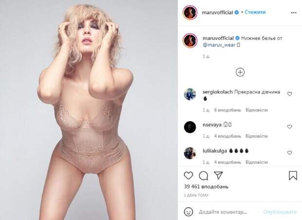 Оттенок белья певицы почти сливается с цветом кожи, из-за чего сначала некоторым пользователям показалось, что звезда на фото вообще без одежды. Следует отметить, что белье на MARUV - от ее собственного бренда. Нежный образ она дополнила белым париком, из-за чего многим фолловерам она напомнила молодую Ирину Билык. Пользователи соцсети оценили образ MARUV, не удержался даже известный российский певец Филипп Киркоров. Также лайки "прилетели" от Сергея Лазарева и Сони Плакидюк. "На Ирину Билык в молодости тут похожа", "Бомба", "Алла Пугачева, показалось", "Маня, я прям весь горю", "Раздевайся уже полностью", "Ай, какая красота", "Красивая", "Боже, Аня, я думал, что ты голая", "Когда уже полностью разденешься?" - пишут в комментариях. Напомним, что скандальная MARUV восхитила природной красотой, забыв про латекс и черные волосы. А еще Politeka писала, что игривая MARUV покрутила бедрами перед юной подружкой, устроив ролевые игры. Также Politeka сообщала, что фигуристая MARUV в тесном комбинезоне расположилась на полу, поразив хищной красотой.