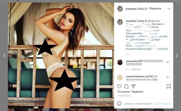 Модель позировала в купальном наряде со стразиками. Наряд почти сливался с цветом кожи и был практических невидимым. Нежная ткань обтянула шикарные изгибы Анастасии, подчеркнув пышную грудь и тонкую талию. Кроме этого, крой соблазнительного купальника оголил "шелковые" ягодицы знаменитости. Квитко откинула голову назад, в ее ухе блестела круглая сережка. Она приоткрыла губы и смотрела в камеру. За два часа пост собрал несколько десятков лайков. Пользователи сети также написали много приятного в сторону обжигающей красотки. "Ты просто огонь", - написал один из поклонников. Ранее сообщалось, что Анастасия Квитко родилась в Калининграде. С детства она мечтала стать моделью. Однако в местном модельном агентстве она не пользовалась популярностью из-за своих нестандартных параметров. Известность ей принесли снимки в соцсети, когда на нее обратил внимание один из известных фотографов. Мужчина был поражен объемами будущей звезды и ее тонкой талией. После серии снимков, красотка стала набирать популярность и сейчас не сдает позиций. Модель уже давно живет в США, где продолжает строить карьеру. Напомним, что Анастасия Квитко сверкнула упругими "булочками", развернувшись спиной: "Королевская кровь". Как сообщала Politeka, Анастасия Квитко показала "широту души" в кофте с глубоким вырезом: "Надувные шарики". Также Politeka писала, что Анастасия Квитко без белья в слишком тонком платье показала торчащую красоту: "Божественная женщина".
