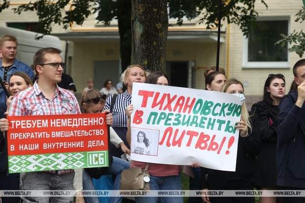 Сторонники президента Белоруссии Александра Лукашенко провели в понедельник пикет у посольства Литвы, передает корреспондент «ПолитНавигатора». Они держали в руках плакаты «Требуем прекратить вмешательство во внутренние дела», «Тихановскую – в президенты Литвы», «Любимую не отдадим».