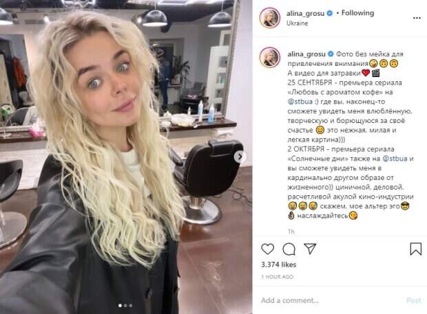 Девушка выпучила глаза, изобразив милую улыбку с ямочками на щеках. На Алине Гросу можно заметить кожаный пиджак и белый топ. Волосы звезда оставила распущенными, продемонстрировав волнистую прическу. Она воспользовалась случаем и в описании рассказала о своих новых проектах: "Фото без мейка для привлечения внимания