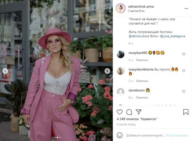 Нередко Анна обсуждает важные для нее вопросы. Продемонстрировал серию фото, на которых она сверкает в розовом костюме с белой кружевной майкой, Саливанчук рассказала об удовольствии, которое следует получать от жизни: «А я просто хочу жить! Получать удовольствие от жизни! Я не хочу никому ничего доказывать, убеждать и оправдывать ожидания. Не хочу тратить время на общение с теми, кто мне неприятен, с людьми, которые меня не понимают, и пытаться достучаться до них. Мне некогда! Я хочу жить своим настоящим. Радоваться каждому моменту, каждой улыбке своих детей или простого прохожего, каждому дню, вне зависимости от того, солнечный он или дождливый. Каждой минуте, проведенной со своей семьей или на сцене перед зрителем! Это все мое и для меня. А потому самое лучшее, что могло со мной случиться» - написала Анна. Фанаты были в восторге: «