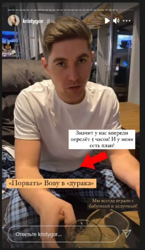 Оказывается, у нее есть особое умение, которым девушка не преминула воспользоваться случаем, чтобы похвастаться. По словам Горняк, им лететь до следующей пересадки 5 часов, и у нее есть план, как "порвать Вову". "Тут едим и пьем... И я говорю Вове, мы взяли с собой карты, и что я тебя сейчас порву в дурачка. Потому что у меня очень хорошая школа - бабушка и дедушка. Спорим?", - заявила за кадром жена Остапчука. "Естественно... Голой выйдешь вообще из самолета!", - резко отреагировал тот, намекнув на свою победу. "А мы что - на раздевание?..", - смущенно переспросила у него Кристина. К сожалению, чем закончились их забавы, история умалчивает. Кадрами путешествия в своем Инстаграм делился и сам Остапчук. Ведущий показал публике, как складывает чемоданы и что в них. «Так, роднульки. Вы просили меня сделать обзорчик чемодана, что же мы берем с собой в отпуск», - рассказал шоумен, продемонстрировав содержимое сумок. В них оказались одежда, легкие снеки и вещи для развлечений. Кроме того, Владимир заснял себя с супругой непосредственно уже в самолете. Для путешествия звезда выбрал клетчатый костюм, как из фильма "Джентельмены", а его супруга была в стильном синем худи. Напомним, что острая на язык жена Остапчука устала молчать и жестко уделала злопыхателей: «Встретимся! » Как сообщала Politeka, скандальный Остапчук показал подросшую дочку и рассказал о семейных проблемах: «К сожалению…» Также Politeka писала, что жена Остапчука в кокетливой пижамке запела в ванной, как Уитни Хьюстон: "Жизнь прекрасна!".