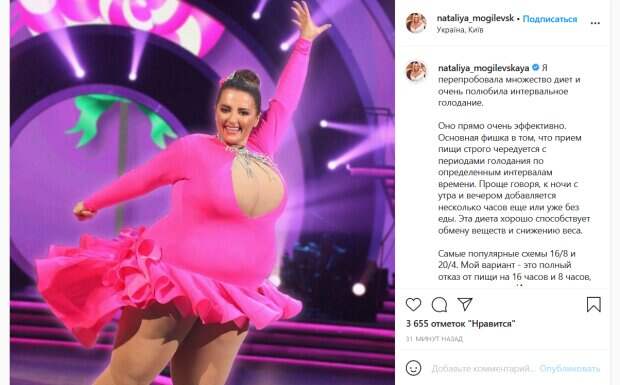 «Я перепробовала множество диет и очень полюбила интервальное голодание…Основная фишка в том, что прием пищи строго чередуется с периодами голодания по определенным интервалам времени… Мой вариант - это полный отказ от пищи на 16 часов и 8 часов, когда есть можно», - написала знаменитость. Она также решила раскрыть свое меню. Так, Могилевская подчеркнула, что она вегетарианка. «Мяско осталось давно в прошлом. Моя основная еда: каши, овощи, фрукты, орехи, семена, травы», - рассказала звезда. По ее словам, на завтрак она ест семена чиа с ягодами и гречаным молоком, на обед – овощное рагу и салат с горчично-медовым соусом, либо вегетарианский борщ с карпатскими грибами и безрожжевой гренкой с семенами, маслом гхи и черной солью. Ужинает певица салатом с бобовыми и орехами. Свой пост Могилевская сопроводила снимком, на котором она с явно лишним весом позирует в розовом танцевальном платье. Впрочем, судя по всему, этот кадр был отфотошоплен и певица на самом деле так не выглядела. Поклонники звезды тут же отреагировали на ее пост. «Фото жесть», «Да, тут одним голодание не ограничиться, обязательно нужно следить за своим меню, тогда всё получится!», «Как колбаса», «Фотка прикольненькая», - пишут люди. Напомним, Могилевская раскрыла, кем ей на самом деле приходится мужчина, с которым ее засекли папарацци: "Он...". Как сообщала Politeka, Наталье Могилевской пришлось прыгнуть с 26-метрового моста в Киеве, появились кадры. Также Politeka писала, что 45-летняя Могилевская в микро-топе померялась формами с 30-летней любимицей публики.
