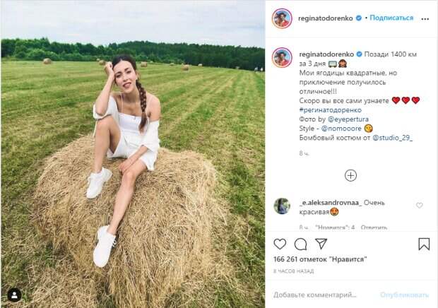 На снимке Тодоренко предстала в белой майке и коротеньких шортах, а позировала знаменитость на стоге сена. Поклонники Регины не смогли сдержаться в комментариях, чтобы не похвалить любимицу за прекрасный вид, но были и такие, которые пытались угадать: где же все-таки находится телеведущая. "Ого! Интересно, где вы и почему не на самолете?", "Вау прям на сеновал захотелось", "Ждём новости. Очень интересно! Что же Регина приготовила?"," Вау, где это такие красоты????","Потрясающая", "Вернулась в "Орел и решку"?, - писали поклонники знаменитости под постом. Напомним, в 2014 Тодоренко прошла отбор и стала ведущей телепередачи шоу «Орёл и решка», но в 2017 объявила об уходе из проекта. На данный момент ведущей телепроекта является Настя Ивлеева. Напомним, Тодоренко и Топалов забыли о скандалах и поразили выходкой у бассейна, видео Также Politeka писала, что Тодоренко после скандалов удивила интимным фото с маленьким сыном А еще Politeka сообщала, что Топалов с ребенком на руках внезапно скрылся от гнева россиян, фото