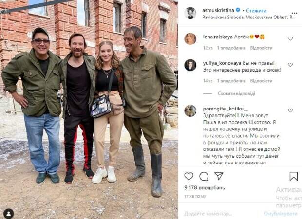 Но я просто оставлю это здесь 💭 Потрясающий день на съемках фильма..» — говорится в сообщении. Обратим внимание, что на опубликованном кадре Асмус позирует в окружении российских актеров, улыбаясь на камеру. «Кристина! Вы красавица и как актриса класс! Живите и снимайтесь! Удачи Вам!», «Вы не правы! Это интереснее развода и сис*к», «Кристина, вернись к Харламову, он тебя умоляет и клянется, что больше не будет гулять с Гузеевой», «Жесть, я не узнала ни Кончаловского, ни Чадова. Просто какие-то грязные мужики стоят. Со стройки наверно», — пишут ее поклонники. До этого актриса Кристина Асмус заинтриговала снимками в пикантном наряде. Кристина является популярной актрисой и после фильма "Текст" обсуждения среди поклонников не утихают. В частности, обсуждают фанаты в основном интимный момент Кристины с актером на съемках, а также развод Асмус с Харламовым. Напомним, разрыв Харламова с Асмус получил неожиданный поворот: «Развелся ради этой…». Как сообщала Politeka, Асмус застукали с красавчиком и кучей подарков после расставания с Харламовым. Также Politeka писала, что Асмус после расставания с Харламовым раскрыла, как развлекается с коллегами в курилке.
