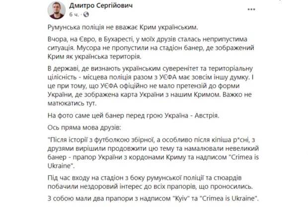 Впрочем, полицейские не пропустили их из-за флага, на котором Крым изображен как украинская территория. Болельщики рассказали подробности другу, который поделился этой историей в соцсетях. "Румынская полиция не считает Крым украинским. В государстве, где признают украинский суверенитет и территориальную целостность - местная полиция вместе с УЕФА имеет совсем другое мнение. И это при том, что УЕФА официально не имело претензий к форме Украины, где изображена карта Украины с нашим Крымом. Трудно не материться здесь", - возмущается автор поста. Правоохранители заявили, что с таким флагом нельзя пройти на стадион, поскольку это якобы политика, и настаивали, чтобы его сдали в камеру хранения. Когда болельщики отметили, что это не политика, а просто факт, украинцев заставили сдать флаги в камеру хранения, и только после этого пропустили на футбол. "Сказали, что Крым – спорная территория между Россией и Украиной и отказались взглянуть на карту в Google maps", – отметили болельщики. Также сообщается, что в ситуацию вмешался украинский представитель полиции диалога, и пытался убедить румынских коллег, что с флагом пропускать на игру можно, но "в результате пообщавшись с ними принял их позицию", призвав не спорить, иначе их не пропустят на стадион. В сети призвали министерство иностранных дел Украины отреагировать на вчерашнюю скандальную ситуацию, а также обратиться к румынской стороне для объяснений и извинений. Напомним, звезда российского ТВ не смог сдержать слов из-за игры сборной на Евро 2020. Как сообщала Politeka, фото формы сборной Украины на Евро-2020 слили в сеть: представят через несколько дней Также Politeka писала, что у футболиста остановилось сердце прямо во время матча, история всколыхнула мир.