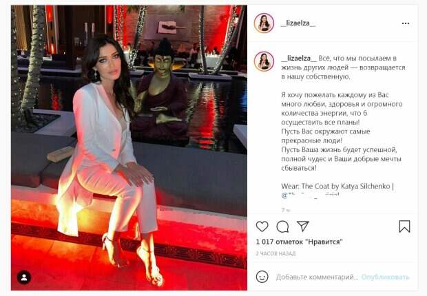 В одном из последних постов модель предстала в стильном белом костюме. Красотка распахнула пиджак, прибавив кадру некого "жара". Красивая прическа и макияж с акцентом на глаза - в этом образе все восхитительно. "Все, что мы посылаем в жизнь других людей — возвращается в нашу собственную. Я хочу пожелать каждому из Вас много любви, здоровья и огромного количества энергии, что б осуществить все планы! Пусть Вас окружают самые прекрасные люди! Пусть Ваша жизнь будет успешной, полной чудес и Ваши добрые мечты сбываться!", - написала Елизавета. За два часа публикация собрала более 1000 лайков и много комментариев: "Милая!