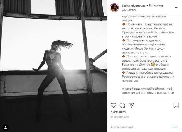 Она регулярно подогревает интерес к себе откровенными нарядами и соблазнительными кадрами. На этот раз девушка поделилась снимком, сделанным на крыше. Она позирует неподалеку от края в обтягивающем черном костюме с большим декольте и туфлях на высоких каблуках. Судя по кадру, Дашу сфотографировали в движении - ее волосы развеваются, руки и колени явно напряжены. Загадочный постапокалиптический образ довершает маска на лице. В описании девушка рассказала, что помогает ей всегда выглядеть на все 100%. Среди бодрящих вещей оказались музыка, разговоры с близкими людьми, вкусная еда, прогулки на природе. "А ещё я полюбила фотографию. Растворяюсь в этом деле целиком и полностью", - пишет Даша. Ранее Ульянова поделилась с поклонниками подробностями личной жизни и призналась, что ее новый избранник не хочет светиться на публике. Кроме того, красотка похвасталась своей грудью. Напомним, Даша из "Холостяка" пустилась во все тяжкие после измены Макса Михайлюка: "Вторая Волочкова" А еще Politeka писала, что в жизни пары из "Холостяка" случилось непредвиденное, Даша ошарашила деталями: "Макс признался, что..." Также Politeka сообщала, победительница "Холостяка" Даша Ульянова без белья ошеломила дерзкой выходкой: "Будущая звезда".