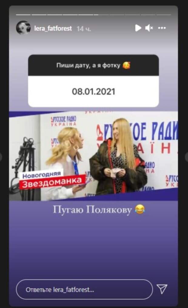 Рандомно, один из пользователей выбрал дату начала января этого года. С ней совпала запись очередного выпуска "Звездоманки" - шоу на "Русское радио Украина", которое ведет Лера. Гостьей эфира была известная певица. "Новогодняя Звездоманка. 8 января 2021 - Пугаю Олю Полякову