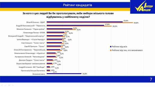 Общественный деятель Андрей Пальчевский и действующий мэр Виталий Кличко остаются фаворитами в борьбе за кресло городского головы столицы Об этом говорится в результатах социсследования, которое было проведено ОО "Центр общественного развития "ИНТЕР-АКЦИЯ". Известно, что соцопрос проводился в Киеве с 5 по 7 сентября, и в нем приняли участие 1500 респондентов.