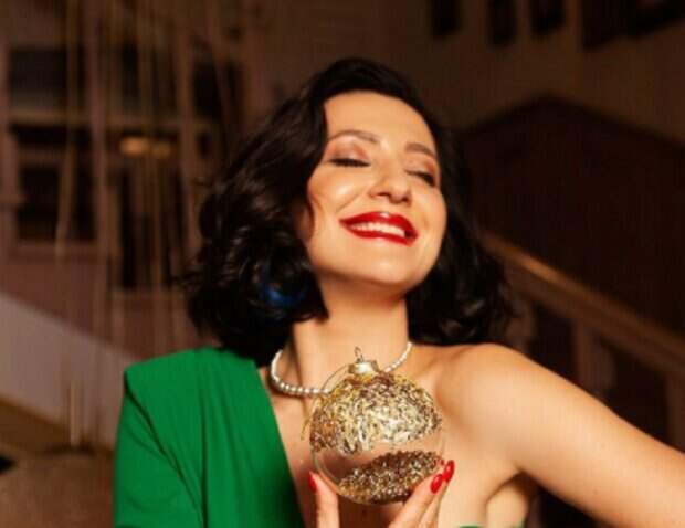 Жена музыканта надела серебристые серьги и сделала красивый макияж. Бабкина оперлась на стол и кокетливо подняла ногу, показав туфли на маленьком каблуке в цвет к платью. "С Рождеством, дорогие Друзья!