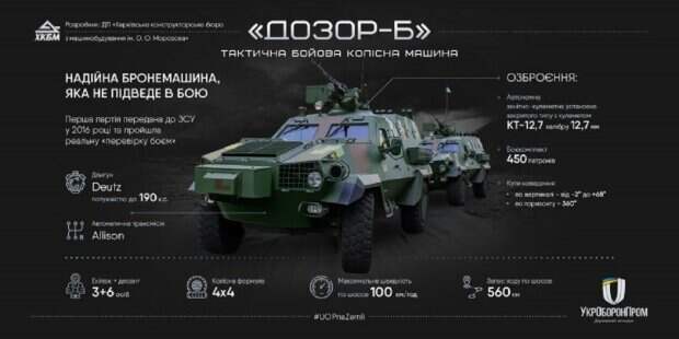 ВСУ приняли новую боевую бронированную машину "Дозор-Б" Об этом сообщает пресс-служба Укроборонпрома. Машину разработали в Харьковском конструкторском бюро по машиностроению имени Морозова, передает Politeka.net. Первую партию из десяти машин “Дозор-Б” в июне 2016-го на основе конструкторской документации ХКБМ изготовили специалисты Львовского бронетанкового завода.