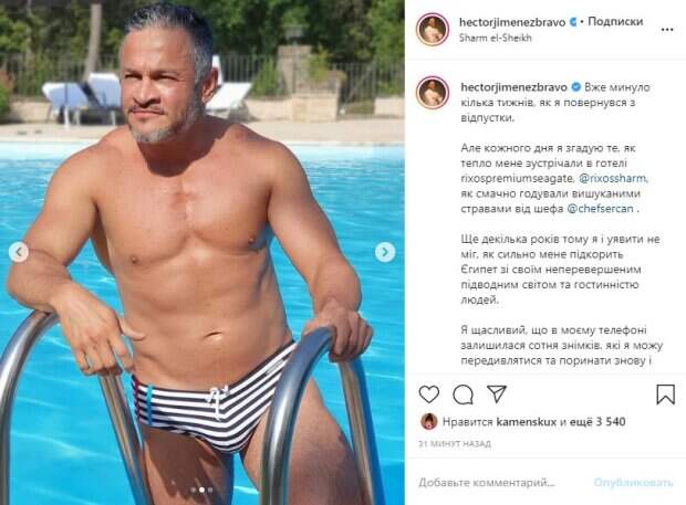 "Уже прошло несколько недель, как я вернулся из отпуска. Но каждый день я вспоминаю то, как тепло меня встречали, как вкусно кормили изысканными блюдами. Еще несколько лет назад и представить не мог, как сильно меня покорит Египет со своим непревзойденным подводным миром и гостеприимством людей. Я счастлив, что в моем телефоне осталась сотня снимков, которые я могу пересматривать и погружаться снова и снова в прекрасные воспоминания. И конечно я еще долго буду делиться этими воспоминаниями с вами", – написал Хименес-Браво. Посмотреть эту публикацию в Instagram Публикация от Hector Jimenez-Bravo (@hectorjimenezbravo) 27 Окт 2020 в 1:48 PDT Фанаты оценили внешность знаменитости, написав об этом в комментариях, а также поставив лайки. Не удержалась и поставила свое "сердечно" и известная украинская певица Настя Каменских. "О боже, какой мужчина!))))♡ Гарний,сексуальний мужчина.. але водограй між ногами зайвий на цій світлині.. Эктор красавец!!!