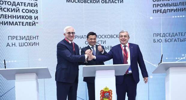 Губернатор Московской области Андрей Воробьев, президент Российского союза промышленников и предпринимателей Александр Шохин и председатель Московского областного союза промышленников и предпринимателей Борис Богатырев поставили подписи под трехсторонним соглашением о сотрудничестве и развитии инвестиционного климата в регионе.