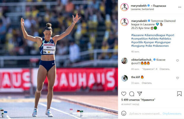 Ей предстоит выступить в секторе для прыжков в длину. Накануне соревнований Бех-Романчук решила показать себя на стадионе. На новом фото спортсменка позирует во время одного из своих выступлений. Она одета в спортивную форму, которая позволяет ей продемонстрировать накачанный пресс и подтянутые ноги и руки. На снимке Марина стоит с поднятыми вверх руками и слегка опущенной головой. Фанаты легкоатлетки бурно поддержали ее в комментариях, пожелав удачи перед соревнованиями. «Классное фото», «Давай Марусь, включай крылья», «Всего самого лучшего», «Вперед», «Победы!», «Одна из самых красивых спортсменов в мире», «Удачи», «Желаю тебе удачи», - пишут люди в комментариях к посту. Напомним, украинская чемпионка Бех-Романчук засветила в купальнике лишнее, фото. Как сообщала Politeka, легкоатлетка Бех-Романчук в купальнике похвасталась подкачанным телом. Также Politeka писала, что Марина Бех-Романчук потрясла загорелыми формами в купальнике на шнуровке.