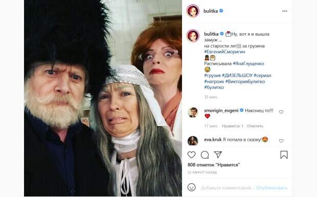 Так, Глущенко позировала в образе эффектной дамы в очках с пышной рыжей шевелюрой. Сморигин преобразился в харизматичного грузинского дедушку с бородой, усами и характерной шапкой. А вот сама Булитко превратилась в пожилую невесту с седыми бровями и волосами. Все трое артистов не смогли удержаться и скорчили для снимка забавные рожицы. «Ну, вот я и вышла замуж ...на старости лет))) за грузина Сморигина. Расписывала Яна Глущенко», - с юмором подписала снимок Булитко. Новоявленный «муж» артистки, Евгений Сморигин, отметился в комментариях. «Наконец-то!», - написал он. Поклонники актрисы также отреагировали на пост. «Я попала в сказку!», «Поздравляю, немного испугалась», «Это прям как в сказке», «Лучшая пара», «вот это перевоплощение», «я бы посмотрел на такую свадьбу», «И сейчас на всех билбордах, газетах, журналах будут писать: Виктория Булитко наконец-таки показала своего муЖчину и вышла замуж», «Совет да Любовь», «Женя похож на Станислава Боклана ))) нашла Вика папика», - пишут люди. Напомним, Виктория Булитко из "Дизель шоу" удивила новой стрижкой и цветом волос: "Ну как вам?". Как сообщала Politeka, Виктория Булитко из "Дизель шоу" растеряла всю свою красоту, фото: черные зубы и прыщи. Также Politeka писала, что звезды "Дизель шоу" в парке избили человека в форме полицейского: появилось видео.