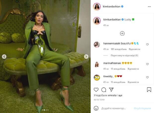 Так, в этот раз эпатажная звезда поделилась с поклонниками результатами удивительной фотосессии, в которой она появилась в весьма провокационном образе. На новых снимках бесстыжая Ким позирует в тусклой зеленой комнате с интересной кроватью. Перед камерой красотка появилась в стильном зеленом костюме, под пиджаком которого видно замысловатый корсет, который подчеркивает фигуру и пышное декольте. Дополняют этот образ объемная кудрявая прическа, яркий макияж и оригинальный маникюр с покрученными ногтями. В подписи к фотографиям Кардашьян написала: "Lucky". А пользователи принялись активно обсуждать снимки, засыпая звезду комплиментами и восторженными комментариями. "Этот образ так хорош", "Вау, в центре внимания позитивные флюиды, да!", "Красиво очень", "Такая привлекательная", "Ты выглядишь великолепно", "Хороший вид, дорогая", "Красота", "Люблю этот образ", "Красотка", "Люблю тебя", "Ты потрясающе выглядишь в этом корсете", - пишут фанаты. Напомним, почти "холостячка" Кардашьян с подружкой в тонких полосках бикини померились сочными изгибами. А еще Politeka сообщала, что почти "Холостячка" Ким Кардашьян без стыда показала, что спрятала под халатиком. Также Politeka писала, что почти "Холостячка" Ким Кардашьян в мини-бикини использовала последний аргумент.