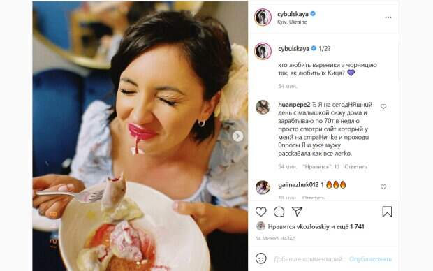 В качестве доказательства Цибульская поделилась красноречивыми снимками. На фото она сидит над тарелкой вареников с вилкой в руках. На довольном лице артистки красуется ягодный сок и сметана, небрежно размазанные по ее губам и подбородку. «Кто любит вареники с черникой так, как любит их Киця?», - поинтересовалась у своих подписчиков певица. Фанаты тут же отреагировали на ее пост. «Приятного аппетита», «Приятного аппетита Киця! А фото…оба крутые! Как ты», «Ооооо, ты, что язык прикусила?», «Не надо торопиться есть вареники вкусные», «Огонь», - пишут люди. Отметим, что не так давно Цибульская оказалась в центре скандала из-за развода ее партнера по сцене и кума в обычной жизни, певца Дзидзьо. Бывшая супруга артиста, певица Slavia подозревала, что ее мужа с Цибульской могли связывать не только дружеские отношения. Впрочем, сами артисты слухи о своем романе упорно отрицают. Напомним, Цибульская неожиданно показала сына и мужа, которого от всех скрывает. Как сообщала Politeka, Дзидзьо после развода со Slavia разоткровенничался с Осадчей о новой любви. Также Politeka писала, что Цибульская обиделась на Могилевскую, чем закончилась вражда артисток.