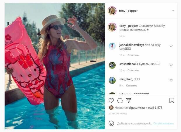 Красотка дополнила летний образ стильными шляпкой и очками. Звезда залезла в бассейн, придерживая яркий матрас. "Спасатели Малибу спешат на помощь ☀️", - подписала снимок Паперная. Публикация собрала более 1000 лайков и немного комментариев. "Что за sexy lady