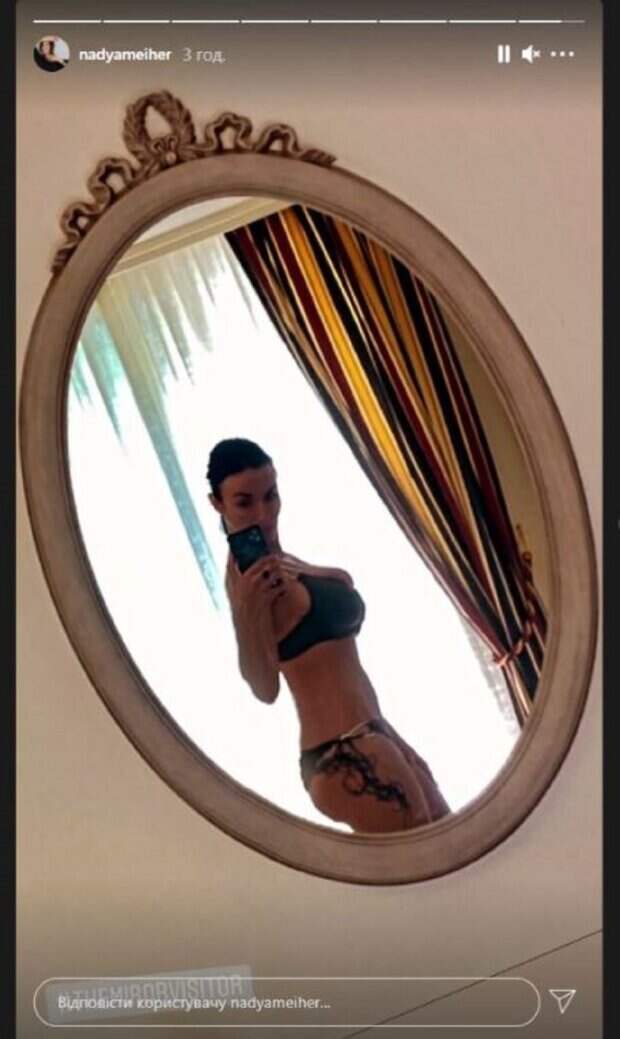 Не забывает красотка и об Инстаграм, где делится с фанатами часто провокационными фото. Этот раз не стал исключением, ведь Надя опубликовала новый снимок в сторис Инстаграм. На нем девушка была в трусиках на веревочках и бюстгальтере. Красотка позировала перед зеркалом, демонстрируя свои роскошные формы не стесняясь, сделав селфи. Пышный бюст прямо выпирал из нижнего белья, но Мейхер это не заботило. Фанаты не ставили лайки и не писали комментарии под фотографией, ведь в сторис Инстаграм отсутствуют подобные инструменты. Напомним, экс-ВИА Гра Мейхер засветила лишнее, приспустив платье на бретельках А еще Politeka сообщала, что экс-ВИА Гра Мейхер в платье на тоненьких бретельках показала декольте с пикантного ракурса Также Politeka писала, что экс-ВИА Гра Мейхер в повседневной одежде покорила видом, отправившись в путешествие