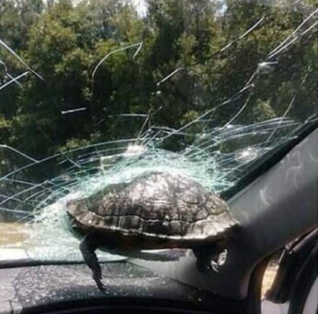 Женщина остановилась и бросилась к другим автомобилистам с просьбой помочь, а также объяснить, что и откуда прилетело в ее машину. Один из мужчин, осмотрев разбитое стекло, объявил, что всему виной неизвестно откуда взявшаяся черепаха.