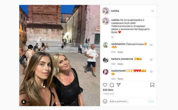 На этот раз Светлана поделилась новой серией фотографий в Instagram. На первом снимке она показала свою повзрослевшую дочь, известную модель, Соню Евдокименко. Сейчас невестка Ротару со своей семьей приехала к дочери в Италию, где они праздновали день рождения легендарной певицы Софии Ротару. "Не останавливайся и совершенствуй себя! Любознательность открывает двери к возможностям будущего. Всем любви", подписала фото Светлана Евдокименко. Поклонники оставили Светлане и её дочери Соне несколько комплиментов: "Красота!", "Принцессы". Ранее невестка Ротару поздравляла в своём Инстаграм Софию Ротару. Ранее сообщалось, невестка Ротару показала взрослых детей, как выглядят внуки легендарной артистки: "Вот это порода!" Также, 74-летняя Ротару закатила гулянку с внучкой и невесткой в свой день рождения: кадры "девичника" Politeka рассказывала, внучка Ротару в белом платье и обычных вьетнамках покорила видом на отдыхе: "Необыкновенной красоты!"