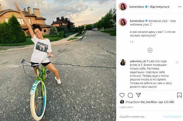 Оля Полякова, Ани Лорак, Настя Каменских и другие красотки показали, как проводят активный отдых На первом фото позирует Настя Каменских. Девушка была в коротких шортах и футболке, позируя за рулем велосипеда. Звезда закрыла глаза от удовольствия и подняла руку вверх, а сама улыбалась. Как можно понять, Настя довольна началом утра за велосипедом.