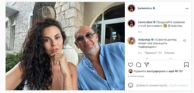 На новом фото, которое красотка выбросила в сеть, Потап и Настя были вместе. Каменских сделала селфи, сделав фото довольно крупным планом. "Придумайте название к этой фотографии", - написала Каменских. "Скажите доктор, может мне уменьшить подбородок?", - написал в ответ Потап. Фанаты поставили почти 50 тысяч лайков и написали комментарии: "Кот Базилио и лиса Алиса.... очень красивые", "Когда жена заставила фоткаться", "У нас есть хорошие новости", "Растворяясь в любви друг друга, смотрим мы на мир с слегка загадочной улыбкой". Напомним, Каменских посреди ночи сиганула за борт яхты, Потап бросился за ней А еще Politeka сообщала, что Потап с борта роскошной яхты заговорил о трудностях звездной жизни Также Politeka писала, что загорелый Потап в отпуске с тещей и экс-женой Позитива похвастался обновками