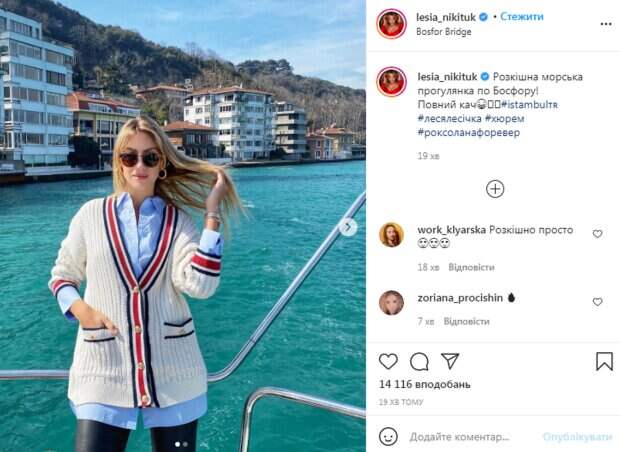 Известная украинская телеведущая Леся Никитюк показала очаровательные фото со своей прогулки в турецком Босфоре Об этом сообщает Politeka со ссылкой на страницу Никитюк в соцсети. Так, в аккаунте Леси появились фото, на которых она позирует на фоне моря. "Роскошная морская прогулка по Босфору! Полный кач", - написала она.