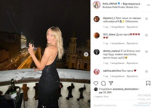 В руках красотка держит бокал с шампанским, игриво поглядывая в кадр. «Ослепительная», «богиня», «Леська – красотка», «Леська, а не холодно?», «Леся какая же вы клёвая, энергичная и светлая