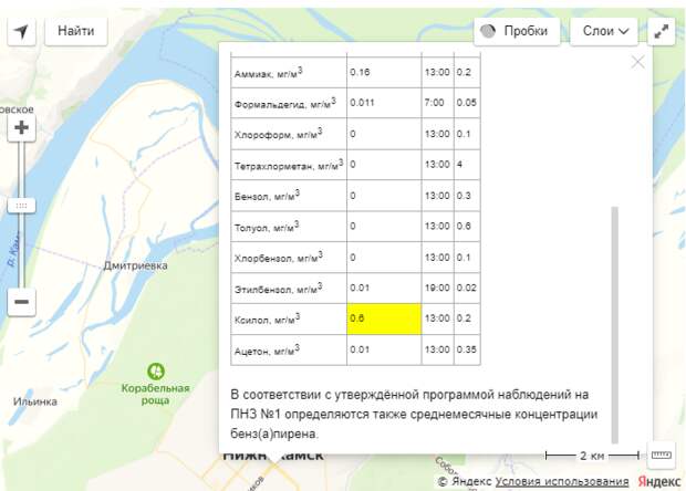 метр. Предельно допустимая концентрация загрязняющего вещества составляет 0,2 мг/куб. метр. скриншот ПНЗ №3, находящийся на проспекте Химиков, в мкр. 36б, зафиксировал предельно допустимую концентрацию ксилола — 0,2 мг/куб. метр. Этот же пост наблюдения за качеством атмосферного воздуха зарегистрировал повышенный уровень аммиака — 0,23 мг/куб. метр при ПДК в 0,2 мг/куб. метр. Данные мониторинга представлены за период наблюдения с 13:00 24 августа по 07.00 25 августа. В Нижнекамске на прошлой неделе зарегистрировали повышенную концентрацию ксилола и аммиака. В Гидрометцентре Татарстана объяснили превышение ПДК загрязняющих веществ 20, 21 и 23 августа синоптическими и метеорологическими условиями, которые сложились в республике 20 и 21 августа. За период наблюдения с 13:00 23 августа по 07:00 24 августа в Нижнекамске выявили превышение предельно допустимой концентрации этилбензола и ксилола в воздухе.