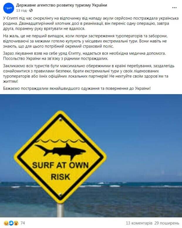 "Мальчик до сих пор в реанимации, он перенес одну операцию, завтра вторая, раненую руку спасти не удалось", - говорится в сообщении. По данным туроператора, мать с ребенком остаются в больнице. Женщина также получила травмы. Отмечается, что лечение взяло на себя правительство Египта, предоставляется вся необходимая медицинская помощь. Туроператор сообщает, что украинку предупреждали о запрете на такого рода экскурсии, но она не послушала. «Сначала туристы обратились к гиду в отеле по приобретению такой экскурсии. Им отказали и предупредили, что правительство Египта запретил дайвинг с плавательных средств. После этого туристы решили приобрести такую услугу у третьих лиц вне отеля, в котором отдыхали», - говорится в сообщении. Сообщается, что семья отдыхала в Шарм-эль-Шейхе, а погружение проходило на территории заповедника «Рас Мохаммед», где остановка экскурсионных яхт запрещена. В Сети активно обсуждают произошедшее и желают пострадавшим выздоровления. «Скорейшего выздоровления», «только 3 дня назад выезжали на снорклинг в хургаде с двумя малыми...», «Я в Египте уже два раза акул видел, это их дом, они там живут», «Дай Бог, чтобы мальчик остался жив! Соболезнования родным», - пишут в Сети. Напомним, акулу поймали в море у берегов Одессы: невероятные кадры. Как сообщала Politeka, легендарное морское чудовище попалось на удочку: «множество ртов», фото аномалии. Также Politeka писала, что оборвалась жизнь 2-летнего мальчика, покусали домашние собаки.