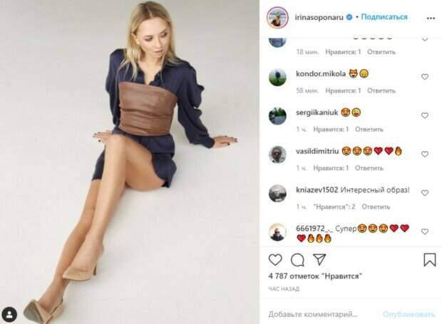 И хотя девушка не меняет прическу или цвет волос, она всегда с легкостью демонстрирует модные наряды, как и в этот раз. Ирина примерила платье-рубашку насыщенного синего оттенка, а также дополнила ее кожаным корсетом-ремнем без застежек спереди. При этом для большей пикантности позировала звезда на полу, подчеркнув также и длинные ножки. «Сижу такая и смотрю в свое светлое будущее))», - написала Сопонару. Смелый образ понравился поклонникам: «Тушите меня