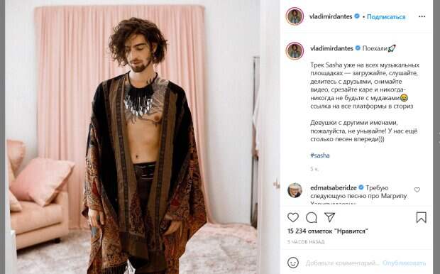 Известный украинский певец и муж Нади Дорофеевой Владимир Дантес показался с обнаженным торсом и рассказал о важном достижении Артист поделился новым постом в Инстаграм, в котором рассказал о выходе своей новой песни Sasha. Об этом пишет Politeka.net. «Трек Sasha уже на всех музыкальных площадках — загружайте, слушайте, делитесь с друзьями, снимайте видео, срезайте каре и никогда-никогда не будьте с м**аками.